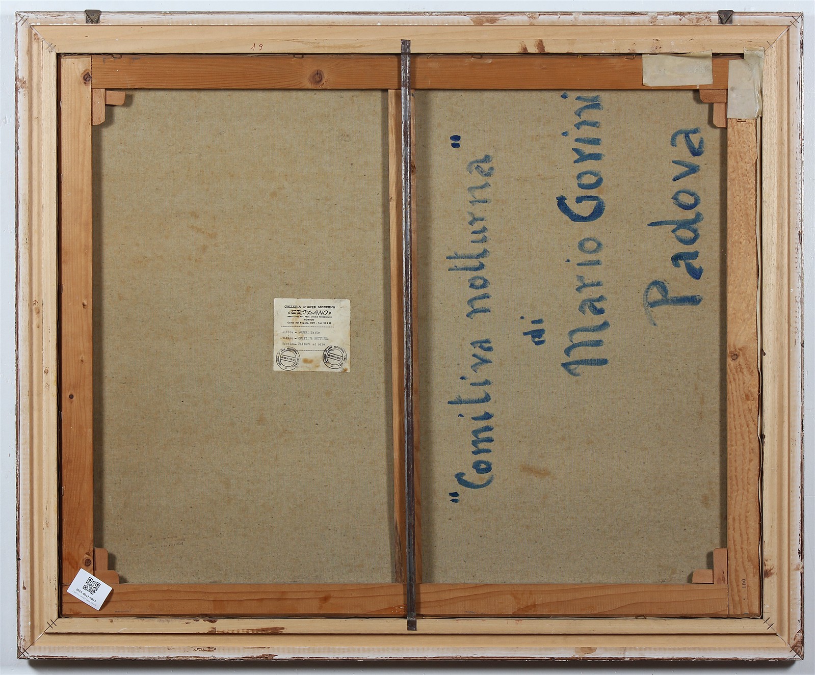 GORINI MARIO (1907 - 1984) Comitiva notturna. Olio su tela . Cm 80,00 x 100,00. Firma in basso a sinistra. Al retro titolo, firma e cartiglio con timbro a cura Galleria d'Arte Moderna Eridano, Rovigo. Cornice presente