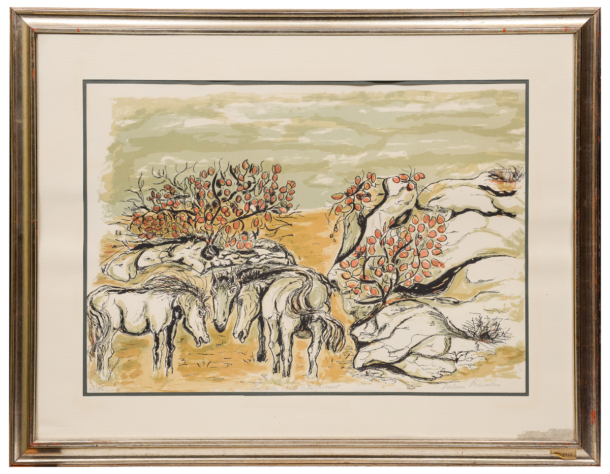 Altre iscrizioni: tiratura“73/85”, “Cavalli nell’altopiano” al recto a matita