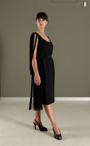 ROBERTO CAPUCCI Abito da sera modello unico, in crépe di seta, corto, scollatura a barchetta tagliato in vita, frange che ornano lateralmente l'abito dal giro manica all'orlo, etichetta "Roma", anni '60 tg. 42 ROBERTO CAPUCCI 1960's Short, black one of a kind evening dress in silk crépe with bateau neckline and side fringes from sleeves to hem. " Roma" Label Italian size 42