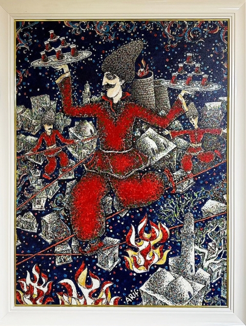 Arif Huseynov, (1943), "Funamboli", 2025, Acrilico su tela, 60 x 90 cm...