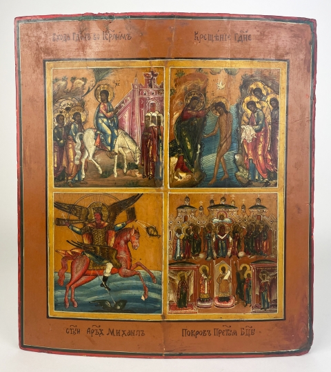 Antica icona russa "Arcangelo Michele, Battesimo di Cristo, San Giovanni Battista, San Michele Arcangelo Voivoda", XVIII secolo,