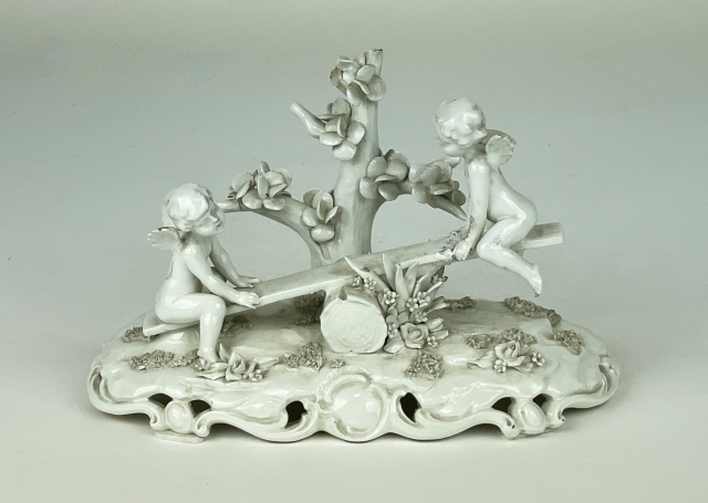 Porcellana artistica bianca, marchiata Vecchia Bassano, raffigurante due angeli suonatori. Seconda metà del 18° secolo,