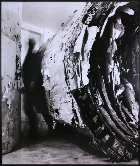 “Documentazione di due cilindri 250 x 250 cm realizzati con manifesti strappati”, 1999, Fotografia in bianco e nero