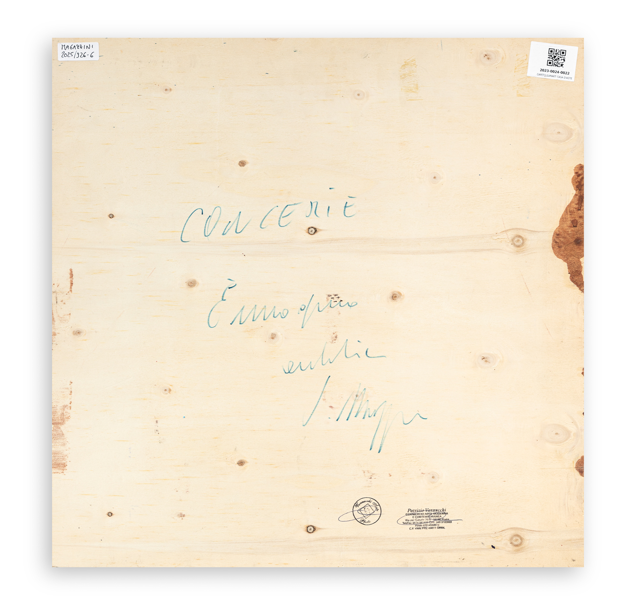 Firma, titolo e dichiarazione di autenticità dell'Artista al retro