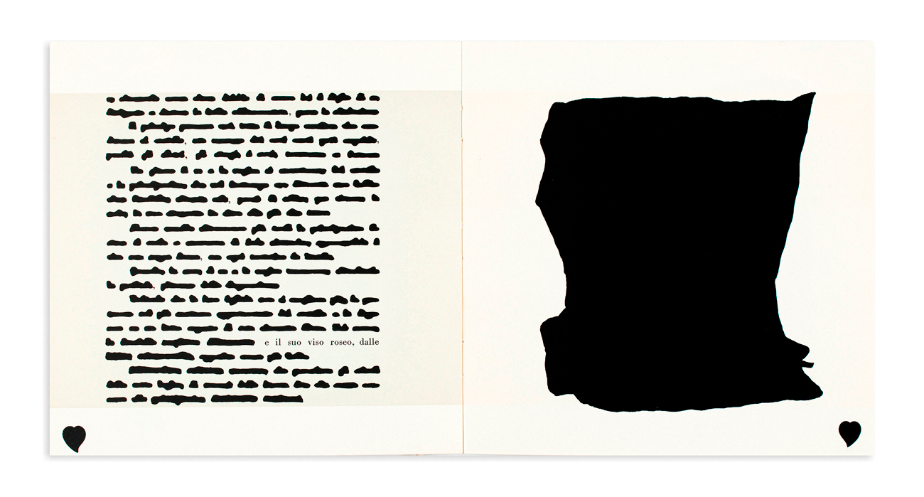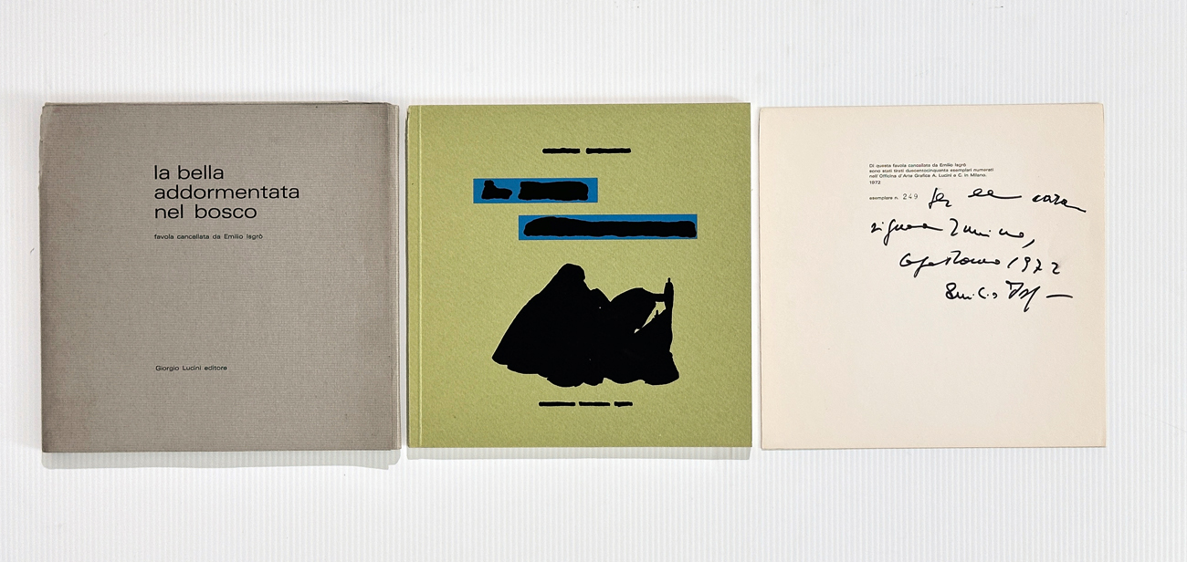 Folder contenente un libretto illustrato con l'omonima favola cancellata da Emilio Isgrò
