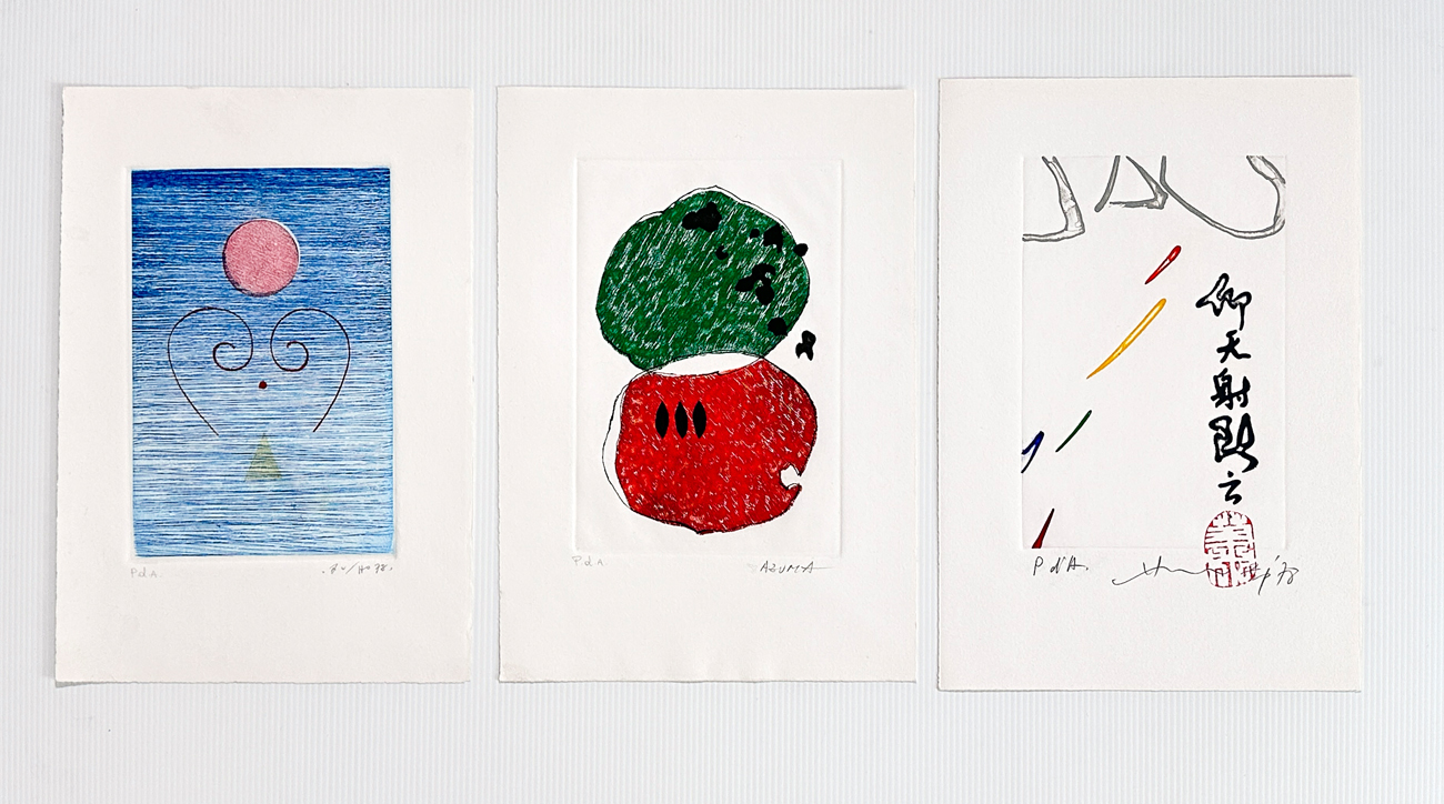 Splendida edizione d'arte contenente 3 acqueforti di Kenjiro Azuma, Hsiao Chin e Ho-Kan, ciascuna protetta da velina e recante firma e numerazione (Esemplari P.d'A.) a matita al fronte