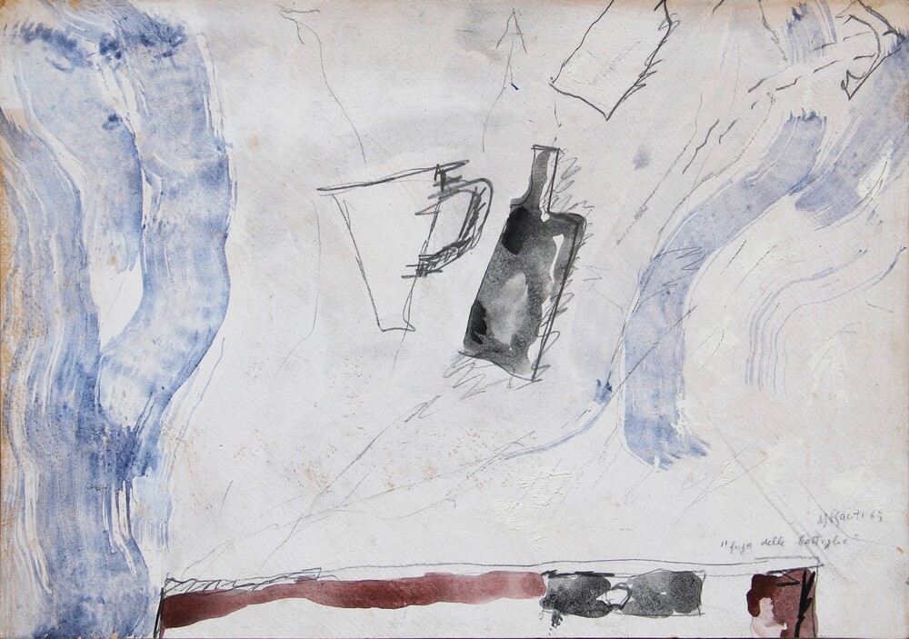 RACITI Mario, Fuga delle bottiglie, 1965, tecnica mista su carta intelata, cm 35x50