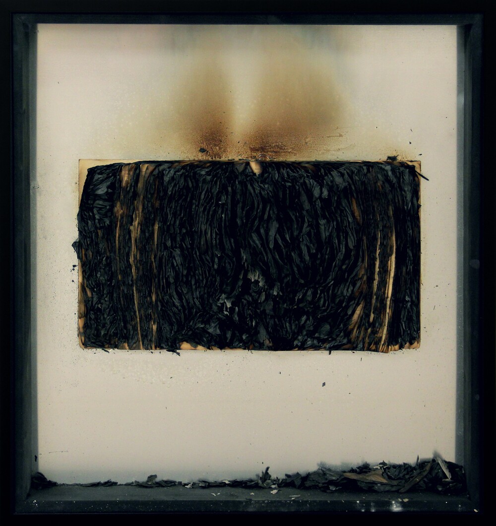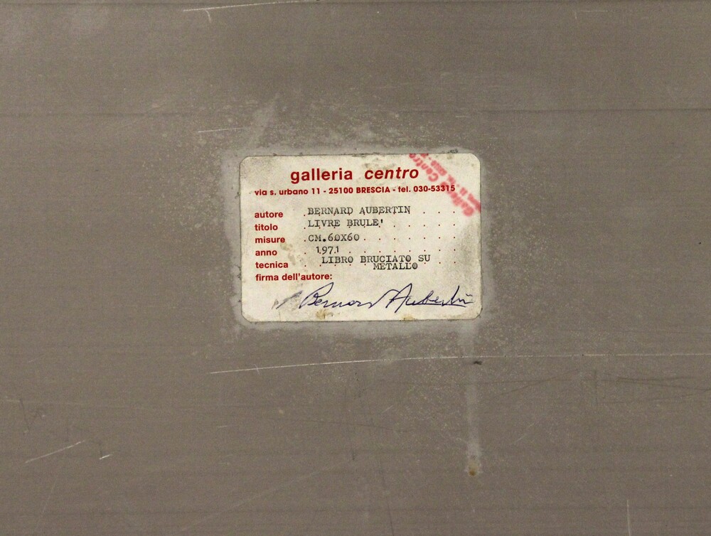 AUBERTIN Bernard, Livre brulé, 1971, libro bruciato su metallo, cm 60x60
