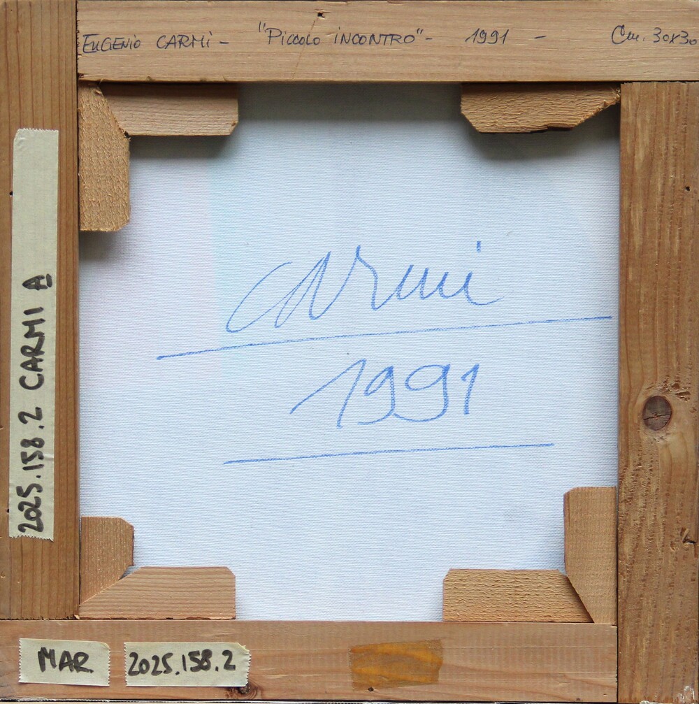 Firma, titolo, data, dimensioni, firma, data "Eugenio Carmi Piccolo incontro 1991 cm 30x30 Carmi 1991" (al retro)