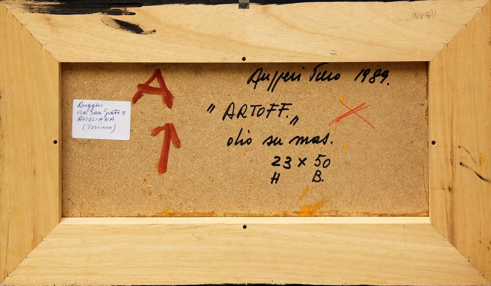 Firma, data, titolo, tecnica, dimensioni "Ruggeri Piero 1989 Artoff olio su mas. 23x50" (al retro)
