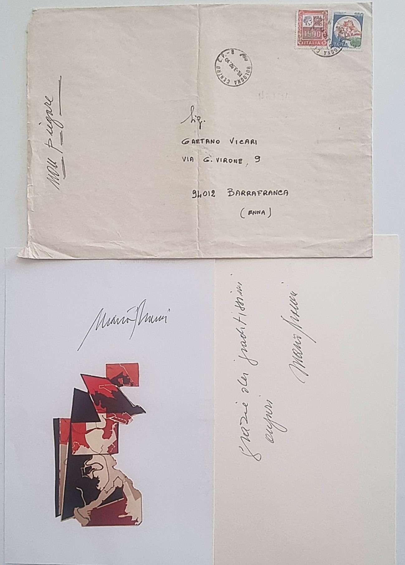 NANNI MARIO Siena 1922 - Bologna 2019 "Senza titolo" Collage su cartoncino cm 16x24. Firmato sul fronte in alto. Disegno su cartoncino cm 15x25, firmato al verso. Corredati da busta per lettera originale.