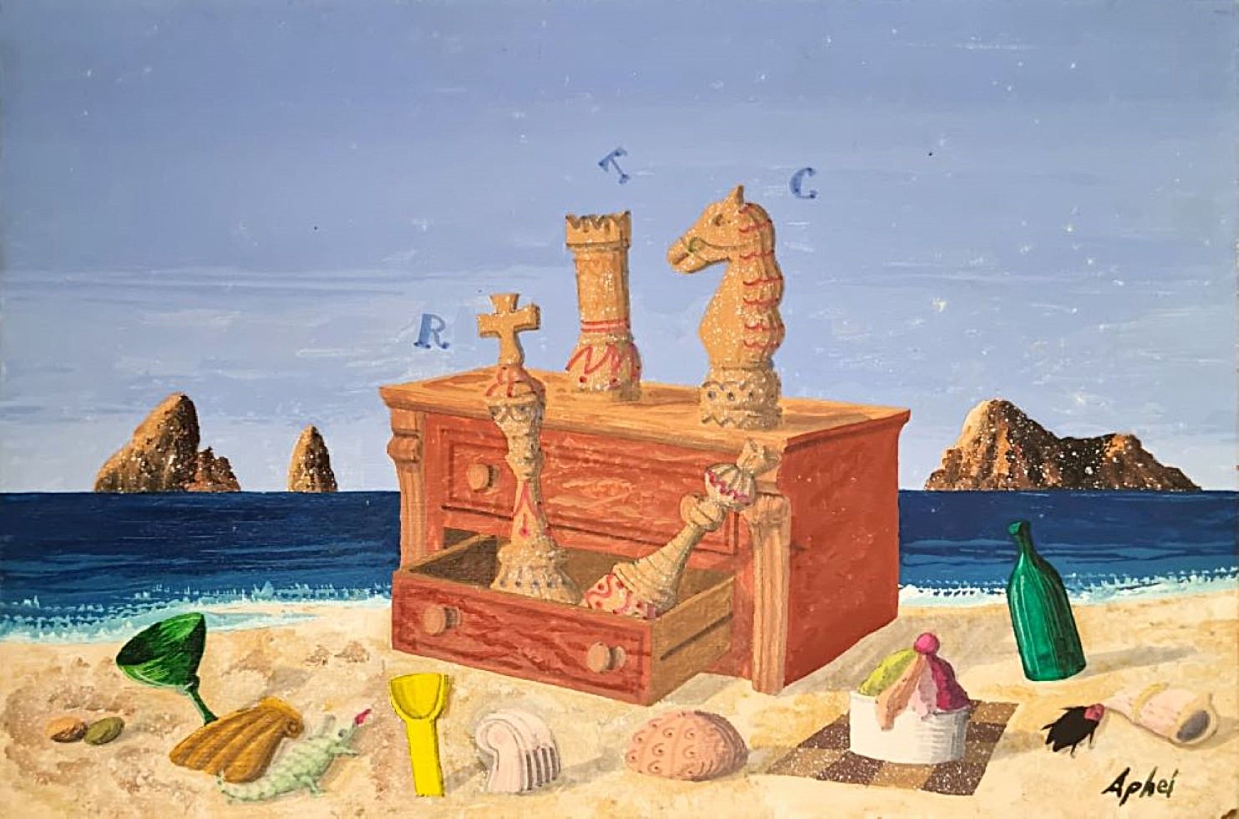APHEL FABIO Cavalese (TN) 1957 "Scacchi mobili" Olio su tavola cm 30x20. Firmato sul fronte in basso a destra. Al verso firma, titolo e numero d'archivio.