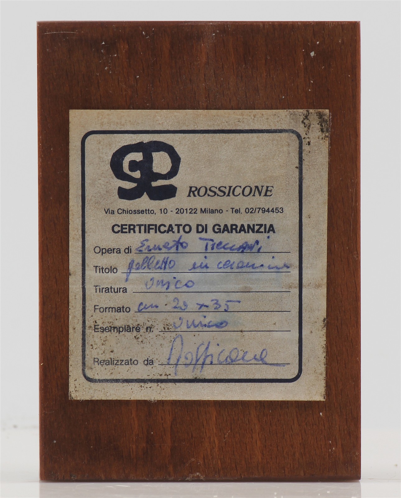 TRECCANI ERNESTO (1920 - 2009) Galletto. Ceramica. Cm 17,00 x 32,00. Firma in basso. Sul basamento certificato di garanzia a cura di Rossicone, Milano.
