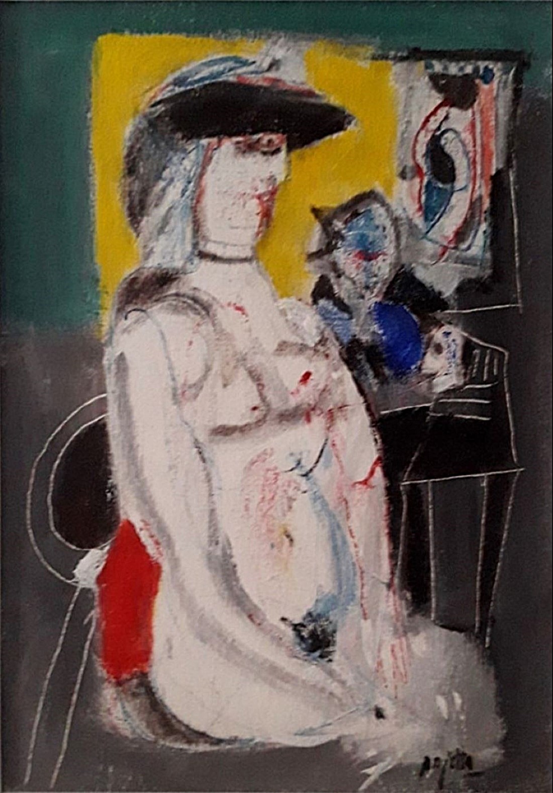 PAJETTA GUIDO Monza 1898 - Milano 1987 "Nudo seduto con cappello nero" Acrilico su tela cm 50x70 del 1971. Firmato sul fronte, in basso a destra. Autentica ed archivio su foto. Opera pubblicata a pag. 1015 del "catalogo generale ragionato dei dipinti" (vol. II) edito da Mazzotta/Crispolti.