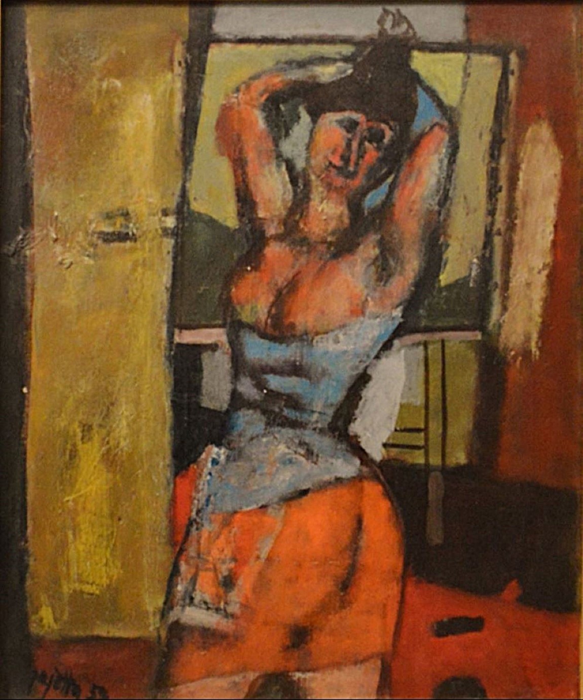 PAJETTA GUIDO Monza 1898 - Milano 1987 "Donna che si esibisce" Olio su tela cm 50x60 del 1955. Firmato e datato sul fronte, in basso a sinistra, al verso timbro e numero d'archivio. Autentica ed archiviazione su foto a cura dell'Archivio Pajetta. Certificato di autenticità e garanzia a cura di Elite Shopping TV. Opera pubblicata sul Vol. I del Catalogo Ragionato dei Dipinti 1914-1963, a pag. 484.