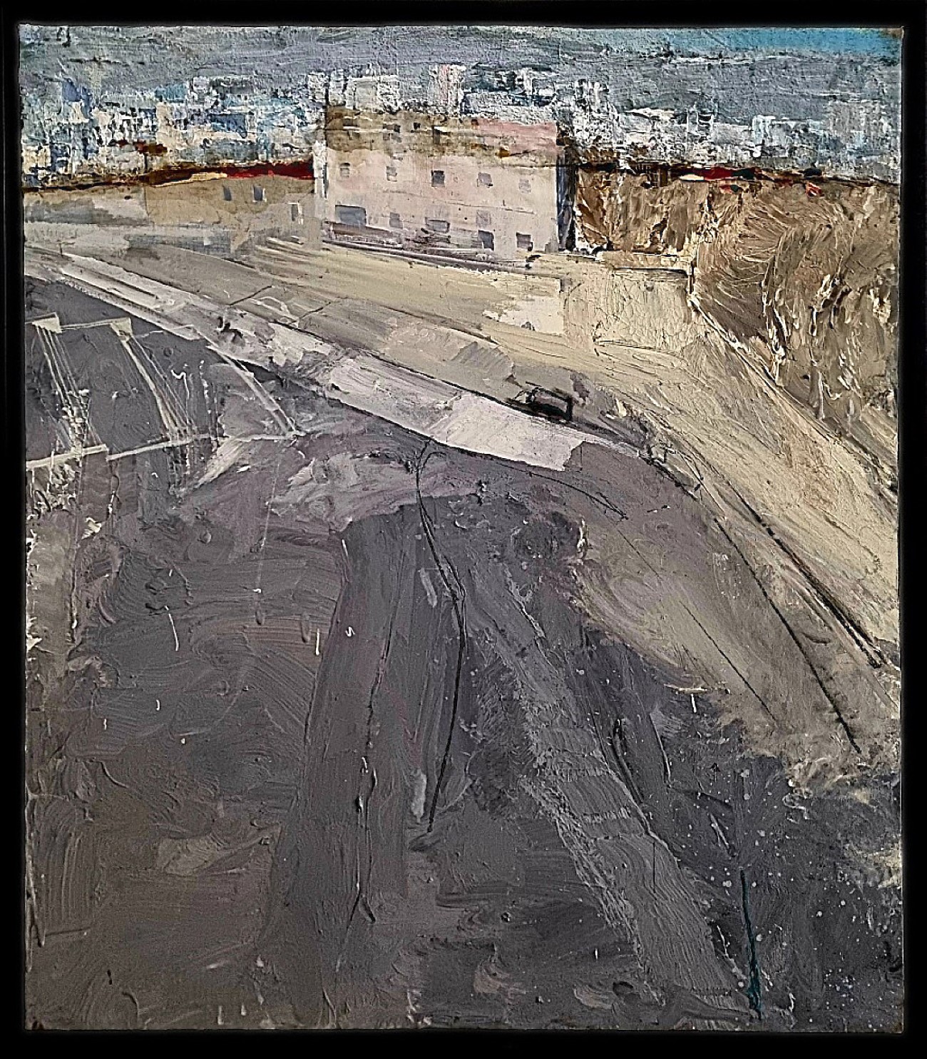 VITALI VELASCO Bellano 1960 "Confine" Olio e collage di tele applicate su tela, cm 140x160 del 2005. Al verso firma, data, titolo, timbro Italian Factory, etichetta della mostra "Arte Italiana Palazzo Reale" ed etichetta "Velasco Art of 20th Century". Autentica su foto a cura del Maestro, foto dell'Artista con l'opera.