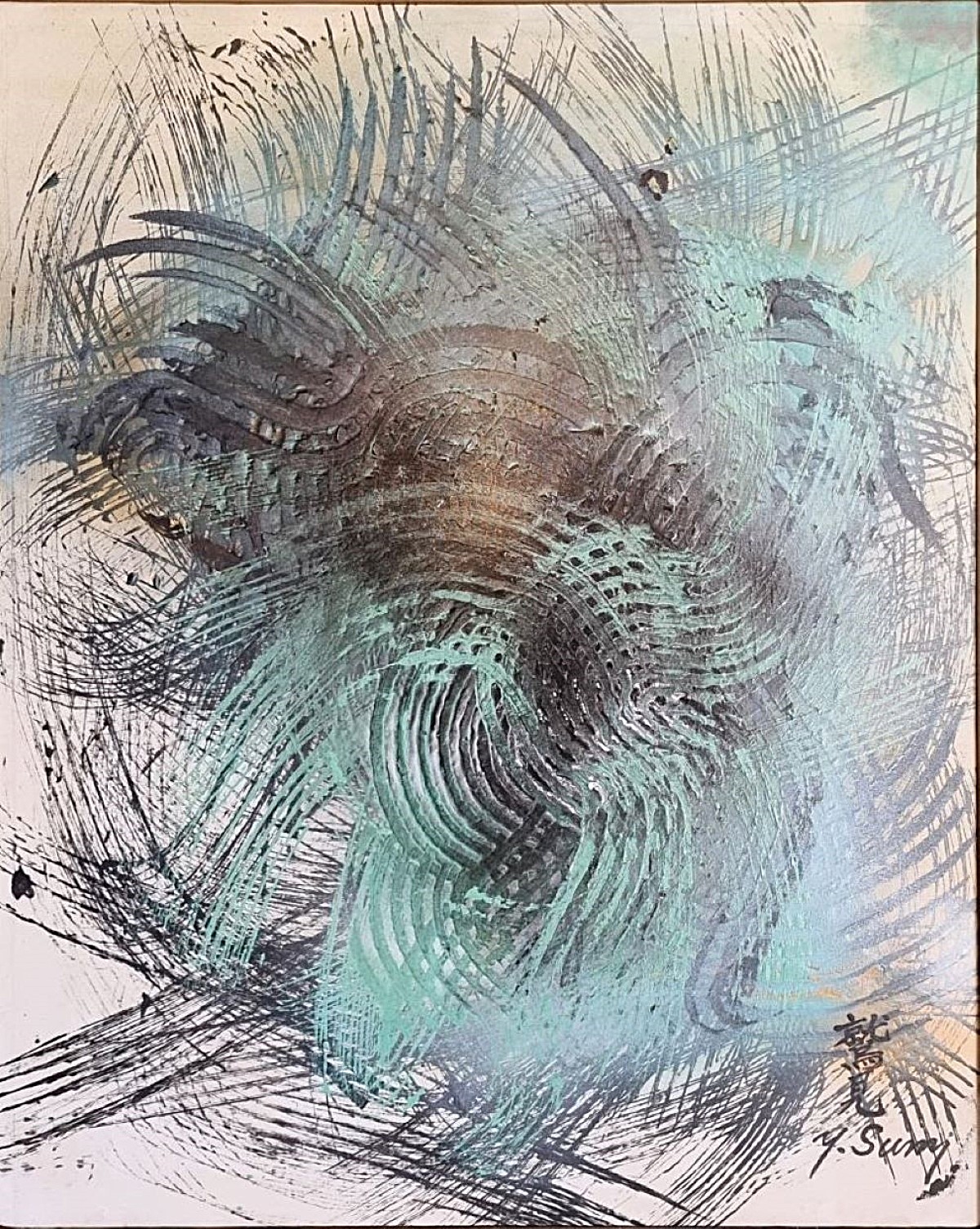 SUMI YASUO Giappone 1925 - 2015 "Senza titolo" Inchiostro, smalto e lacca spray su tela cm 72,8x91,1 del 1986. Firmato sul fronte in basso a destra. Certificato di autenticità su foto a cura dell'archivio generale dell'Artista.