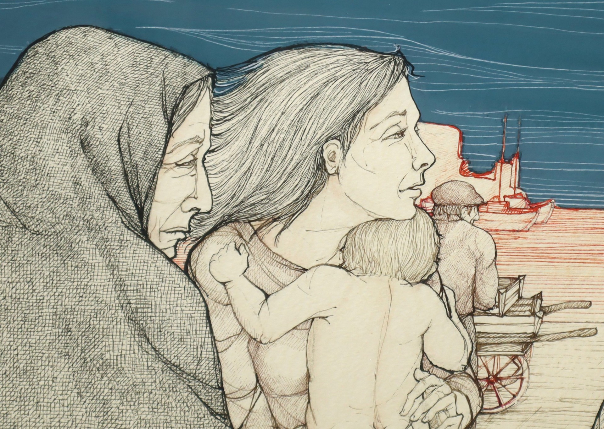 Tina Jacobs (Rijeka 1931 - Milano, Italia 2003) - Donne con bambino cm 29x49 in cornice cm 61x81 tecnica mista china e acquerello