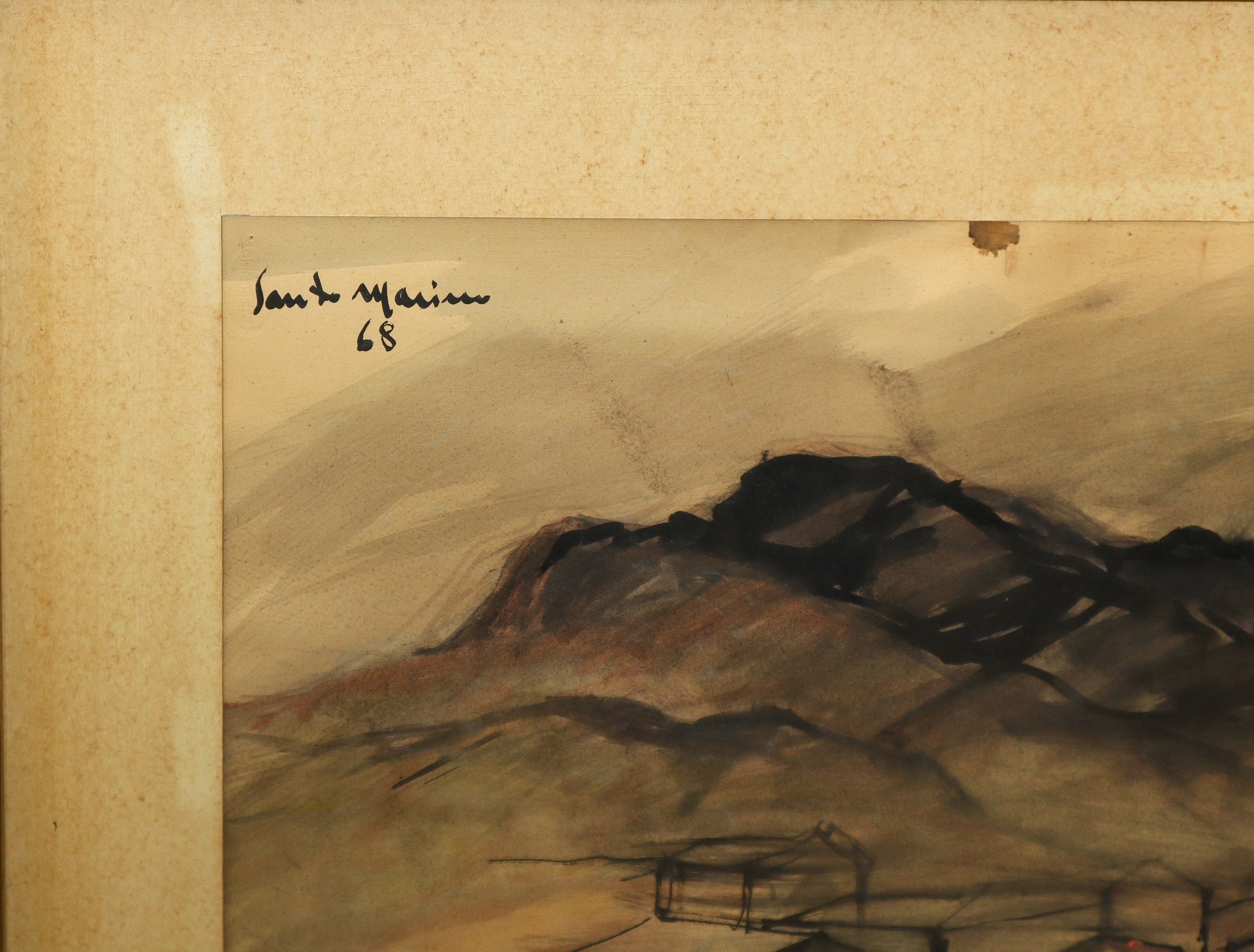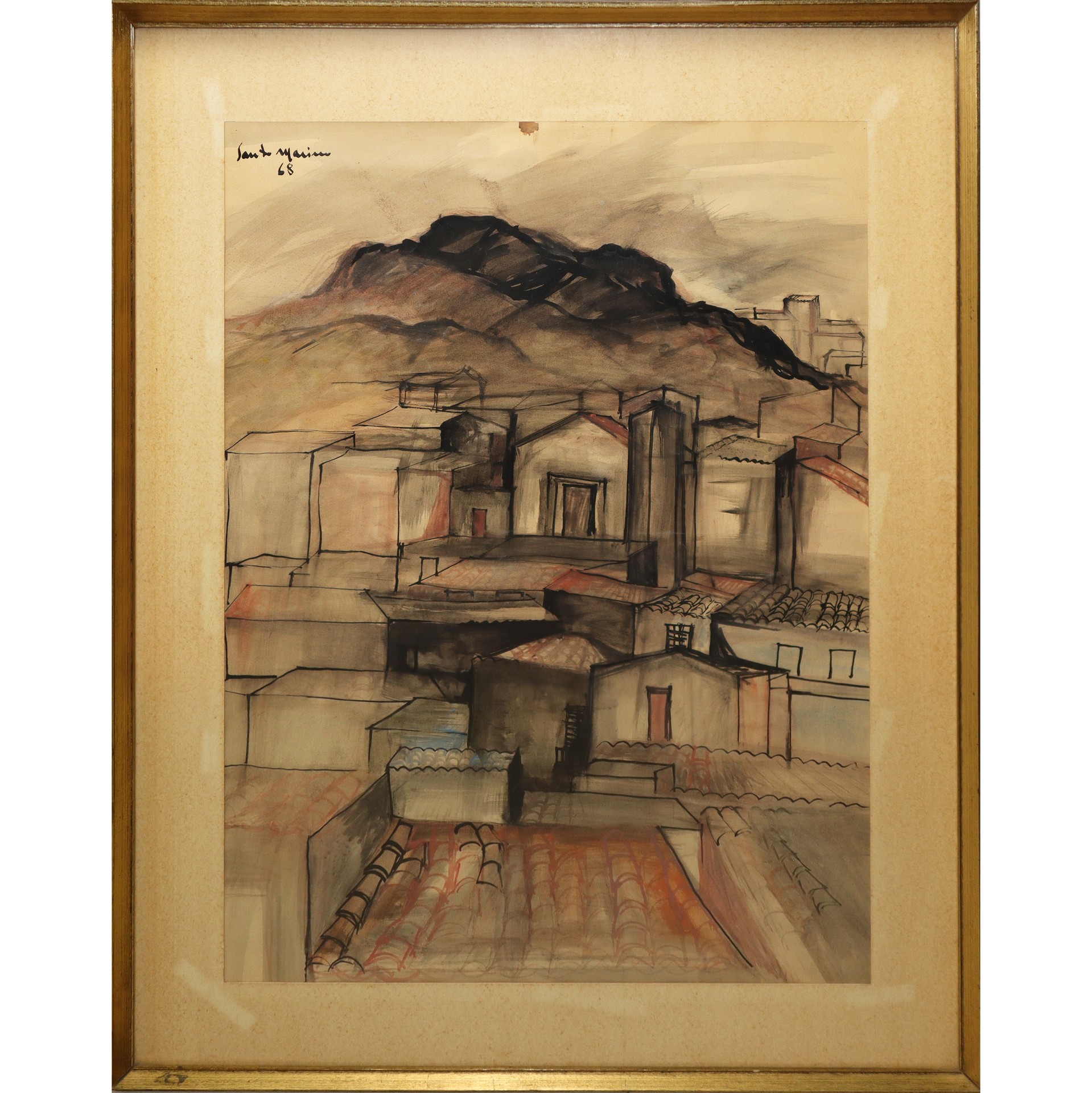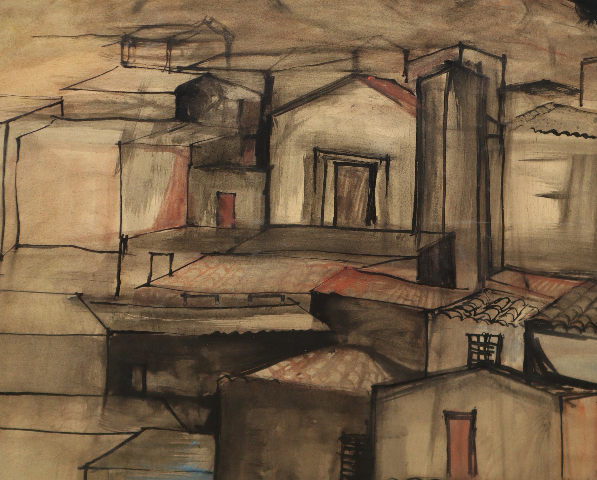 Santo Marino (Militello val di Catania 1924 - 1991) - Tetti di casi con monte, 1968 H cm 68x48 - in cornice H cm 85x64 Tecnica mista su cartone