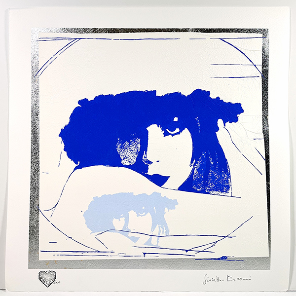 FIORONI GIOSETTA, "Doppio Liberty" Blue e azzurro, Serigrafia materica con pigmento Arancio Luminoso con Floccaggio. 50x50 cm. Applicazione di carta velina e foglio argento realizzata a mano (Vedi immagini in allegato). Opera su carta Pescia in cotone da 350 grammi, formato 50x50 realizzata in 125 esemplari per tutto il mondo, dei quali 100 numerati da 1/100 a 100/100 in numeri arabi, 25 numerati da I/XXV a XXV/XXV in numeri romani e alcune P.A. per l'artista. Firma in basso a destra. Numerazione in basso a sinistra con timbro dell'Archivio Parise Fioroni. L'opera è stata realizzata in occasione del 50° anniversario di Spirale Milano Editore