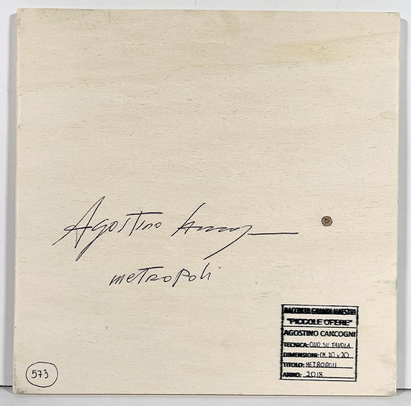 CANCOGNI AGOSTINO, "Metropoli", olio su tavola, 20x20 cm, anno 2018, autentica dell'artista su fotografia