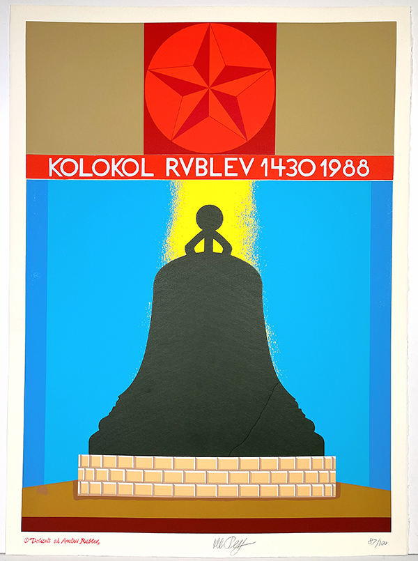 DEL PEZZO LUCIO, "Dedicata ad Andrej Rublev", serigrafia su carta da acquerello pregiata "Arches" con elementi fustellati incollati a mano, 76x56 cm. Titolo in basso a sinistra firma in basso al centro numerazione in basso a destra