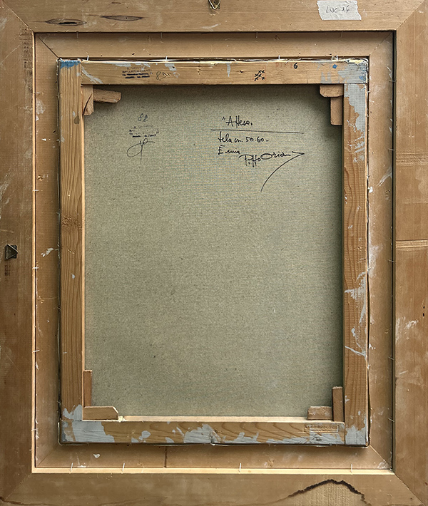 PIPPO ORIANI, "Attesa", 1965, olio su tela, cm 49,5x59,5. Al fronte: firma in basso a destra. Al verso: titolo, tecnica, misura, firma e dichiarazione di autenticità da parte del maestro. Opera archiviata al n° FPO/MV1327.Opera con cornice.