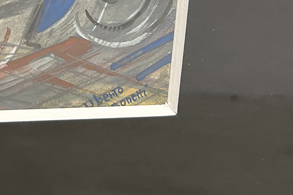 UBERTO BONETTI, "Ferrara", anni '30, acquerello e tecnica mista su carta, cm 20x30, con cornice 63x53. Al fronte: firma in basso a destra. Al verso: titolo. Opera pubblicata nel Catalogo "Anni '30, l'Italia nelle aeroviste". Opera con cornice