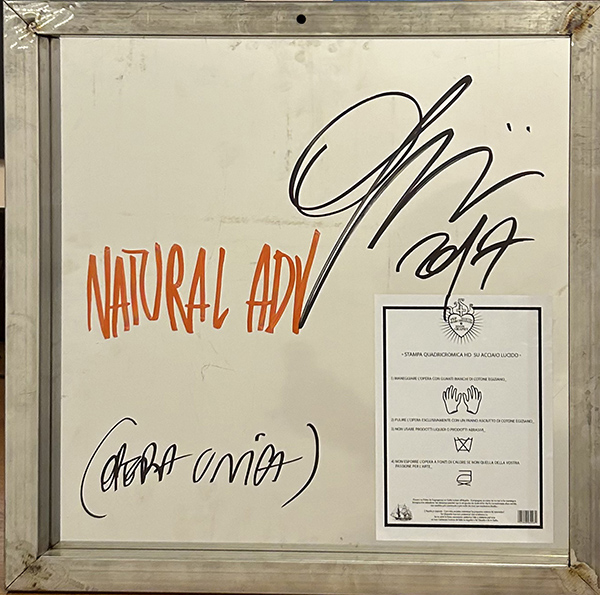 PEP MARCHEGIANI, "Natural adv", 2017, stampa quadricromica su acciaio mirror, cm 50x50. Al verso: titolo, anno, firma, "opera unica". Opera custodita in teca di legno