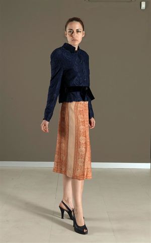 ELSA SCHIAPARELLI Rarissima gonna al ginocchio di seta a pieghe di color arancio tenue con stampe floreali e geometriche, modello unico, realizzata con tessuto firmato Schiaparelli, anni '70 Tg. 42 ELISA SCHIAPARELLI 1970's rare, one of a kind,silk, knee length skirt with printed floral and geometric pattern in orange hues created with "Schiaparelli" fabric Italian size: 42