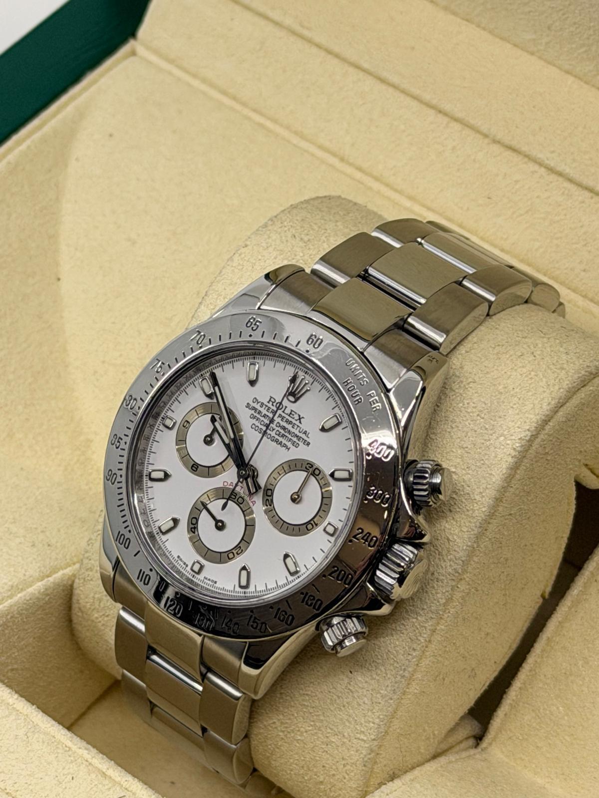 Marca Rolex Modello (Orologio) Daytona Numero di referenza 116520 Carica Automatico Materiale della cassa Acciaio Materiale cinturino Acciaio Anno di produzione 2008 anno approssimativo documenti originali Rolex, no box Carica Automatico Cassa Materiale della cassa Acciaio Diametro 40 mm Impermeabile 10 ATM Materiale lunetta Acciaio Vetro Vetro zaffiro Quadrante bianco Cinturino chiusura corta Materiale cinturino Acciaio Colore cinturino Acciaio Chiusura Déployante Materiale chiusura Acciaio - COMMISSIONE D’ASTA 25%
