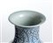Vaso a balaustro dipinto in blu sottocoperta con simboli della felicità coniugale su un fondo a fiori di loto stilizzati e girali fogliate.