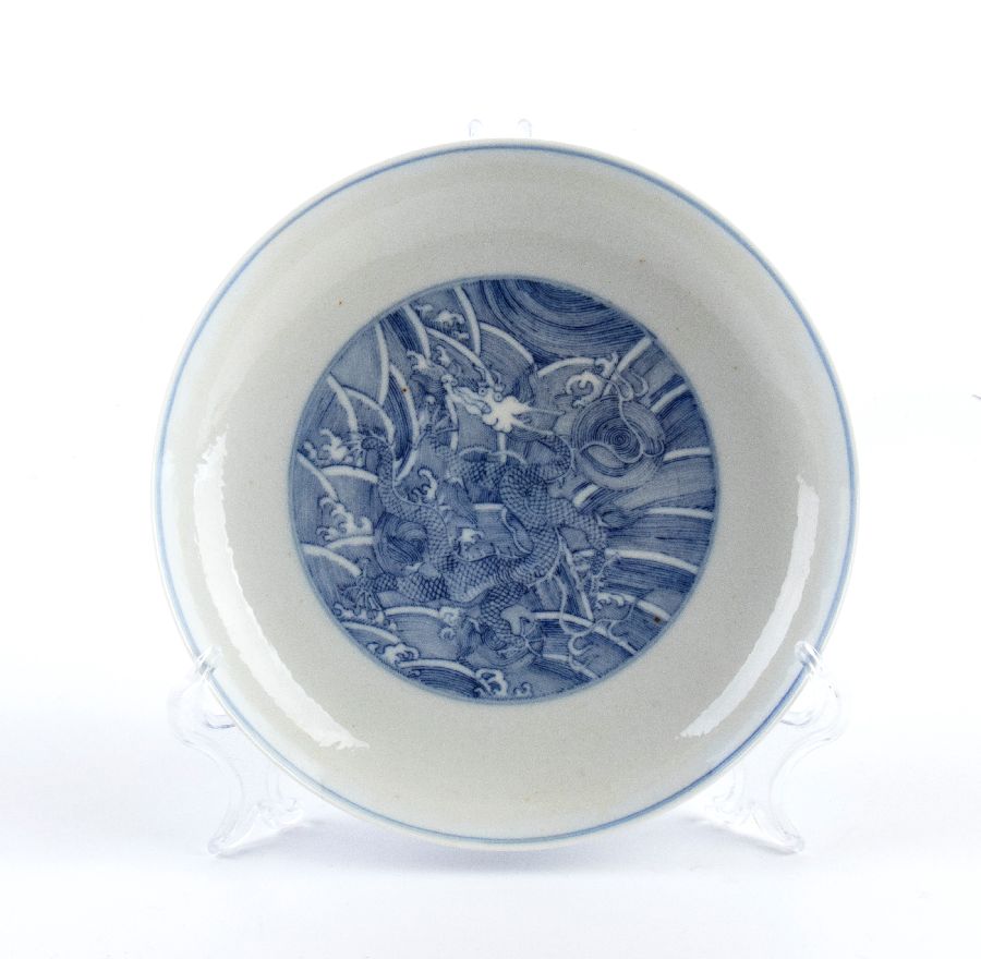 Lot 28 | Piatto in porcellana bianca e blu con drago entro riserva, Cina dinastia Qing, periodo Qianlong (1736-1795) Diam.17,5cm