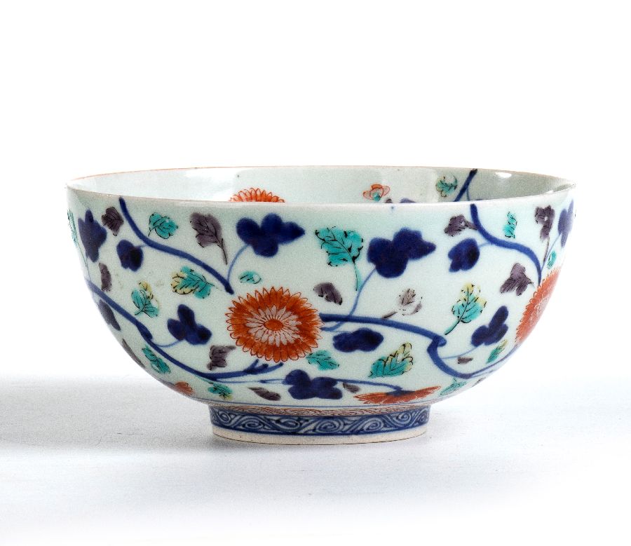 Ciotola "Imari" decorata in blu sottocoperta e smalti policromi con piante e fiori di crisantemo nella parte esterna, fiori di peonia sul fondo.