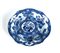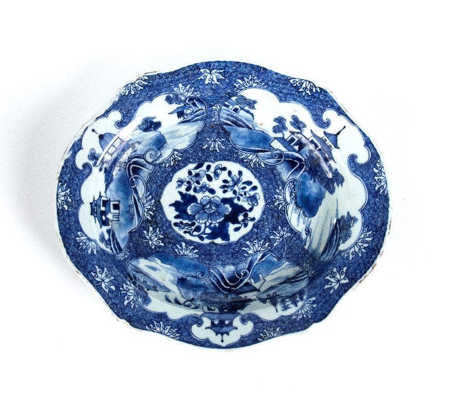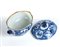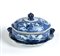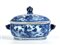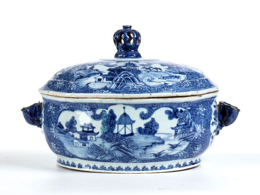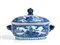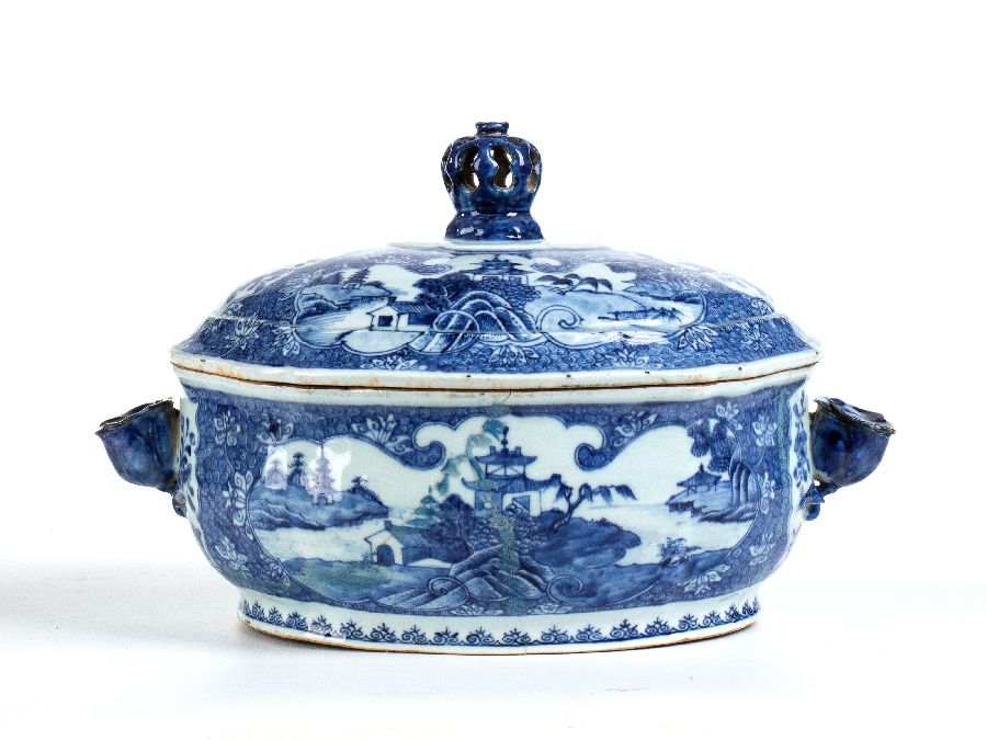 Zuppiera in porcellana con coperchio e piatto da portata, interamente dipinta in blu sottocoperta con scene naturalistiche e paesaggi entro cartigli su uno sfondo a fiori di loto indiani e girali, manici in forma di fiori e pomello superiore a forma di vaso traforato. Difetti.