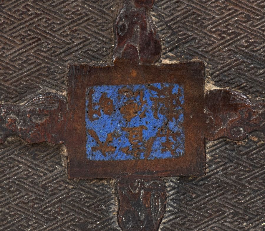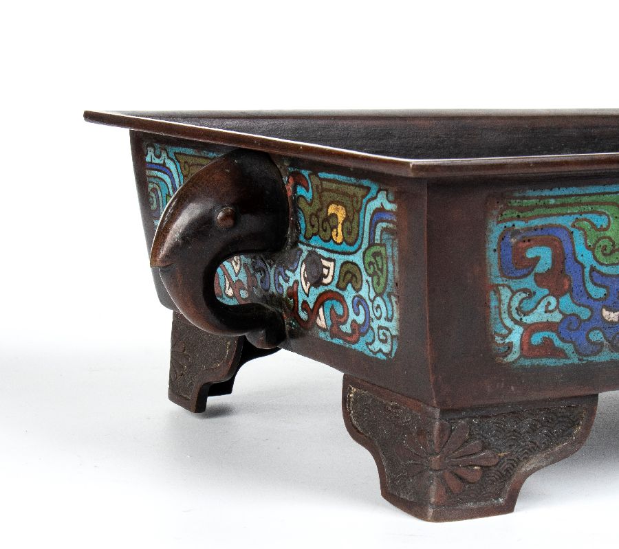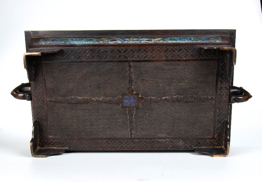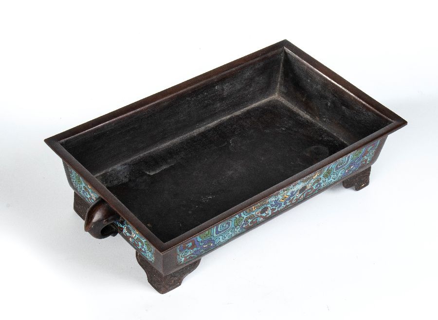 Grande braciere in bronzo di forma rettangolare a smalti cloisonné di tipo “shippo” sui lati con maschere di Taotie stilizzate ed anse laterali a forma di Kirin. Marchio apocrifo “Xuande” sotto la base.