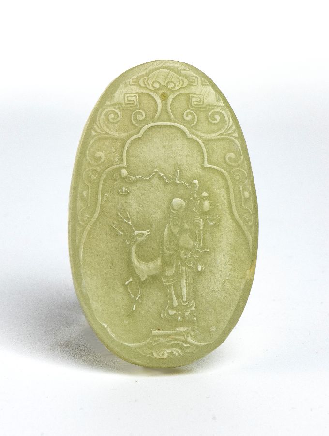 Placchetta ovale in giada decorata a leggero rilievo con Shoulao accompagnato da un cervo e poema sul retro.