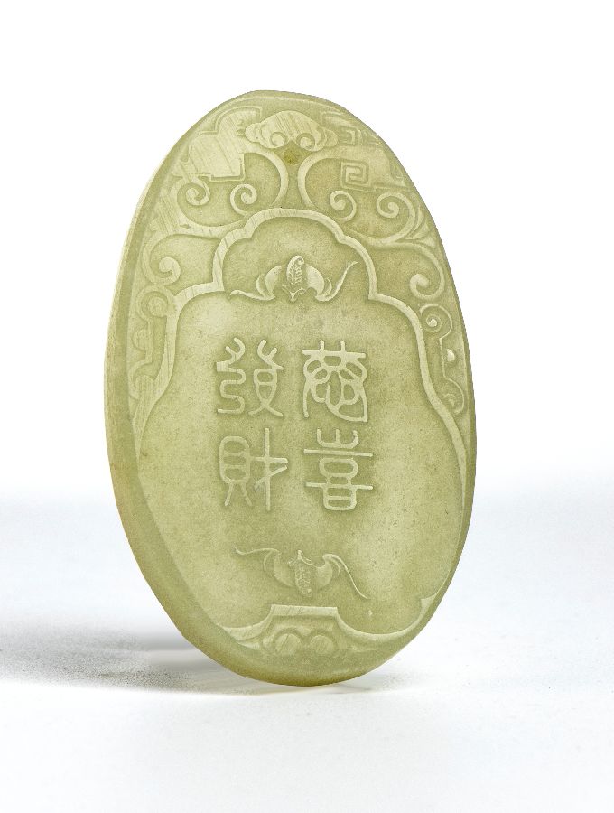 Placchetta ovale in giada Cina, XX secolo. 7 X 4,3 cm