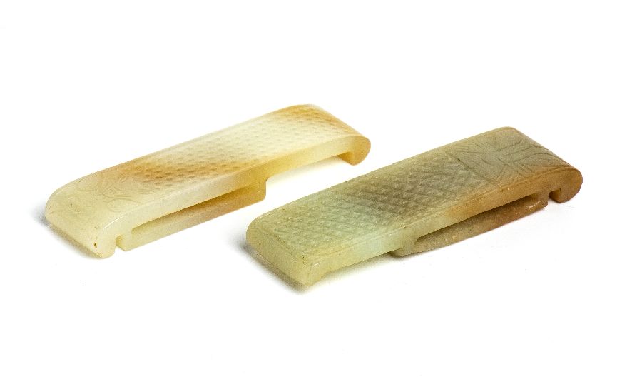Coppia di ornamenti in giada intagliati in stile arcaizzante nello stile Han.