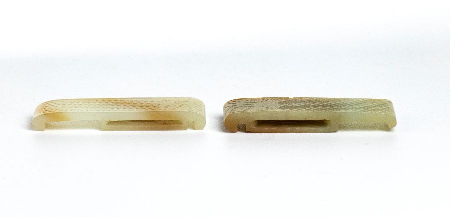 Coppia di ornamenti in giada intagliati Cina, XIX-XX sec. 8,1 X 2,1 cm; 8,5 X 2,5 cm