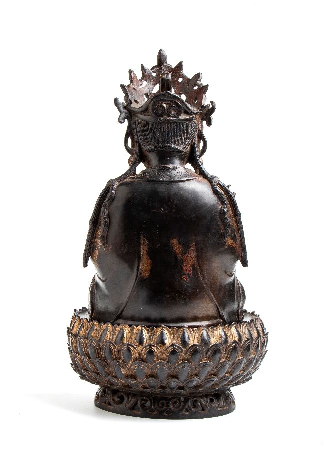 Figura in bronzo di Bodhisattva su insolita base a forma di petali di loto a più livelli Cina, dinastia Ming, inizio XVII secolo. Alt. 53 cm