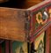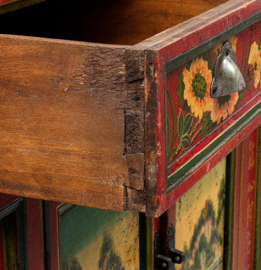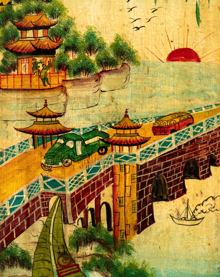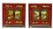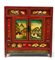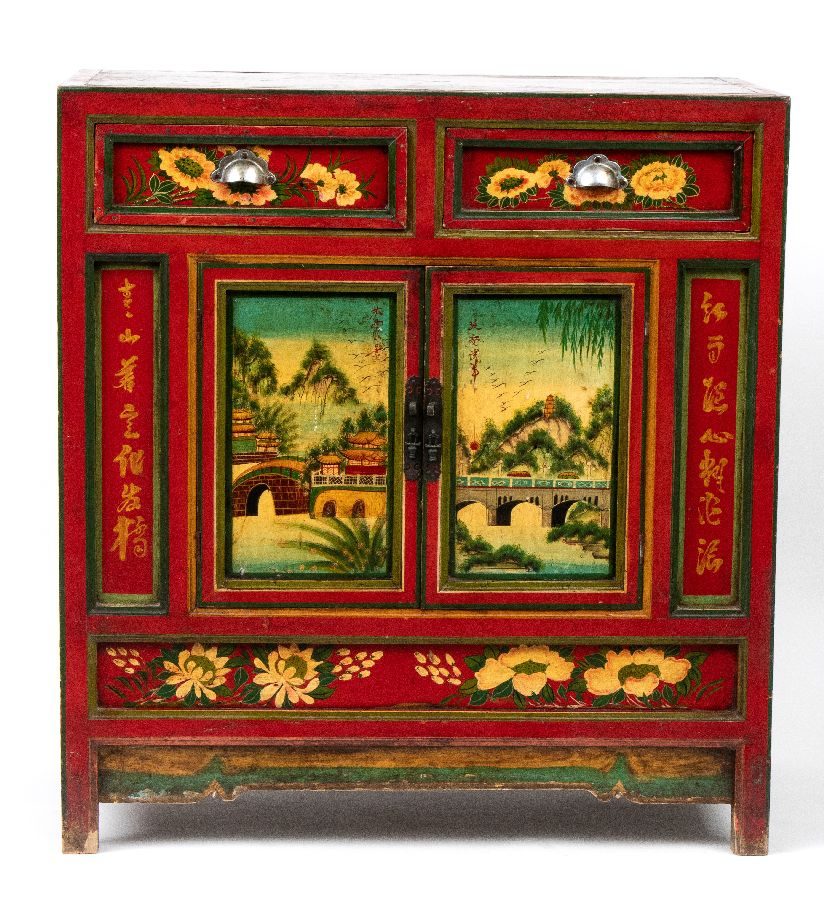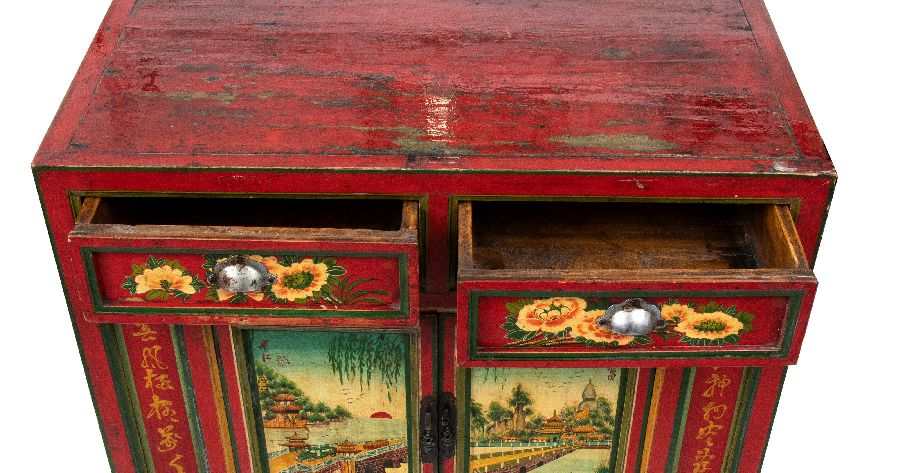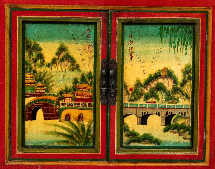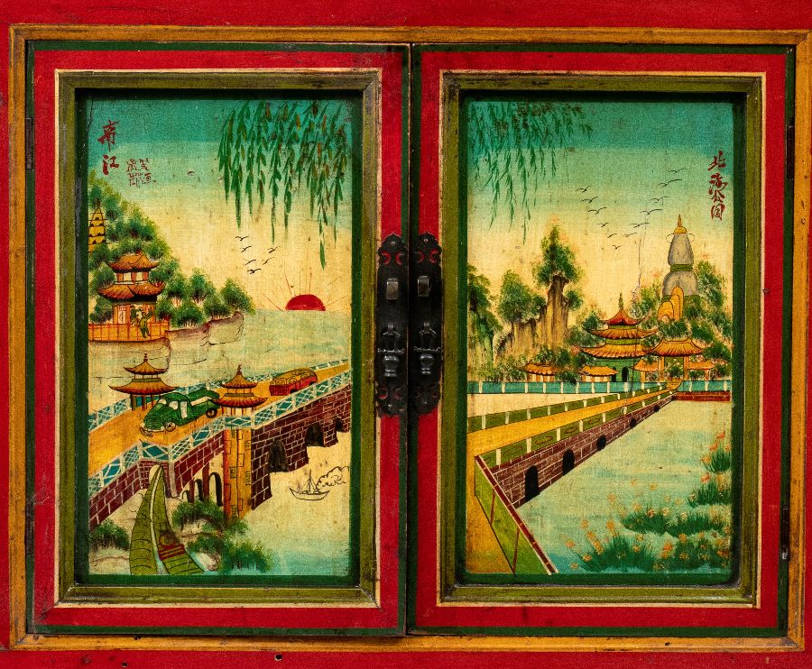 Rara coppia di mobili di design cinesi con decori di monumenti e pagode della Cina imperiale con insolita raffigurazione di numerosi simboli dell’iconografia maoista. Due guardie rosse affacciate al balcone della pagoda stringono tra le mani il libretto rosso circondati dai raggi del sole rosso che “illumina il popolo”, il progresso industriale viene rappresentato con le macchine e gli autobus sfreccianti su i ponti ed una nave a vapore nell’ acqua. La campagna politica di questa epoca guidata da Mao Zedong mirava a trasformare la “vecchia cultura” per affermare quella nuova. Questo ha avuto un forte impatto sulla produzione di oggetti d’arte, come in questo caso sui mobili.