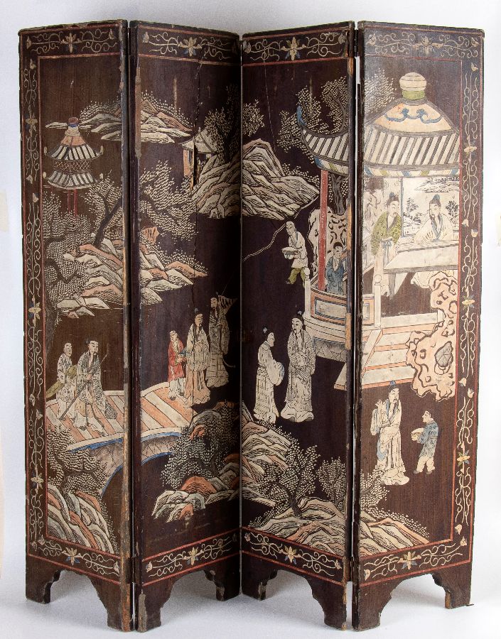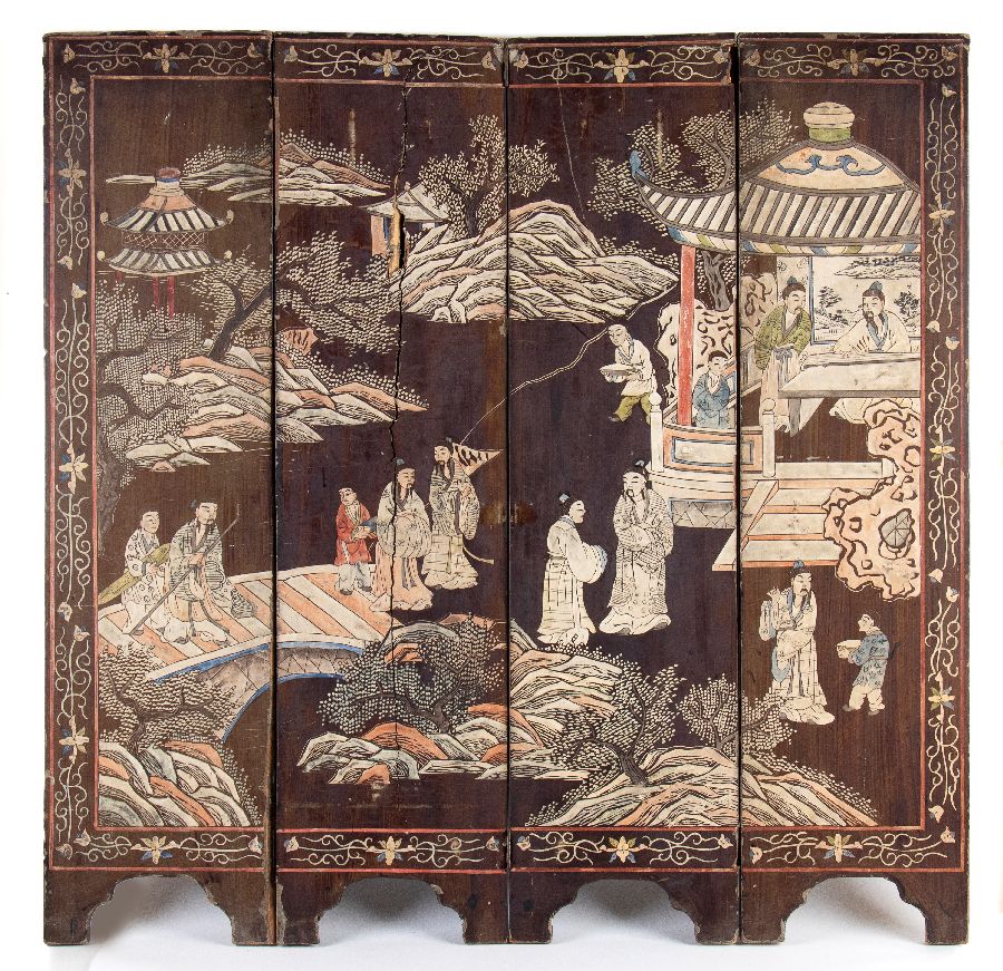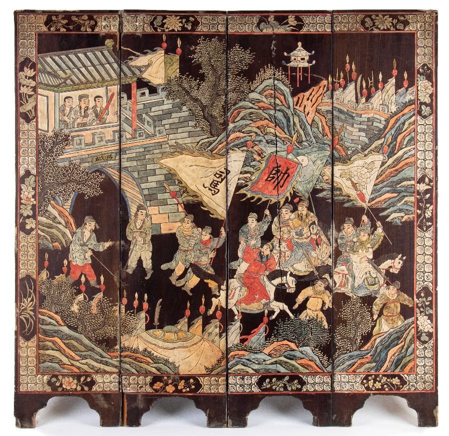 Bel paravento pieghevole a quattro pannelli in lacca Coromandel decorati su entrambi lati con scene di personaggi impegnati in varie attività all'interno di contesto paesaggistico e scene di corte.