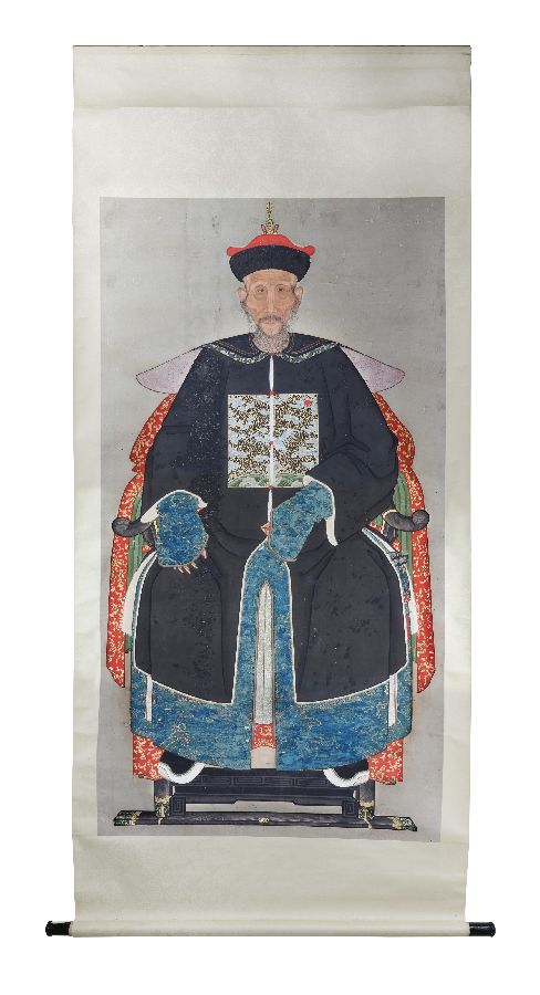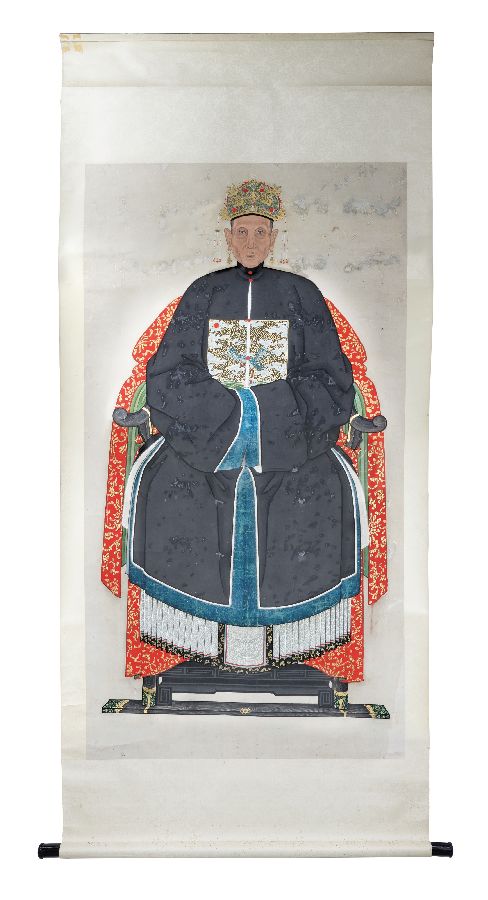 Coppia di dipinti ad inchiostro e colore su carta raffiguranti un funzionario cinese di alto rango e consorte.
