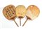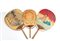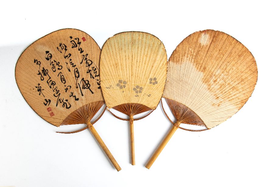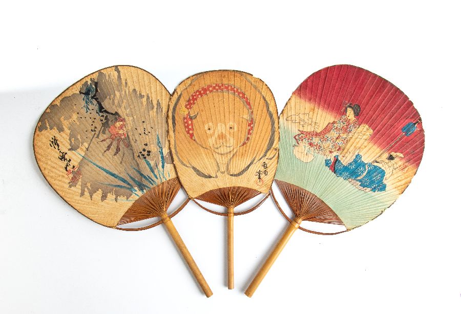 Tre ventagli in carta dipinta e telaio in bambù. Decorati con soggetti diversi.