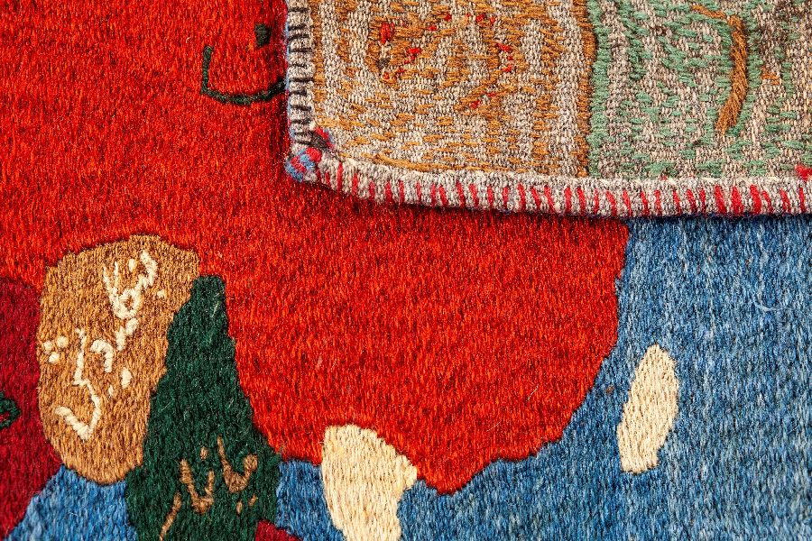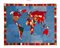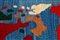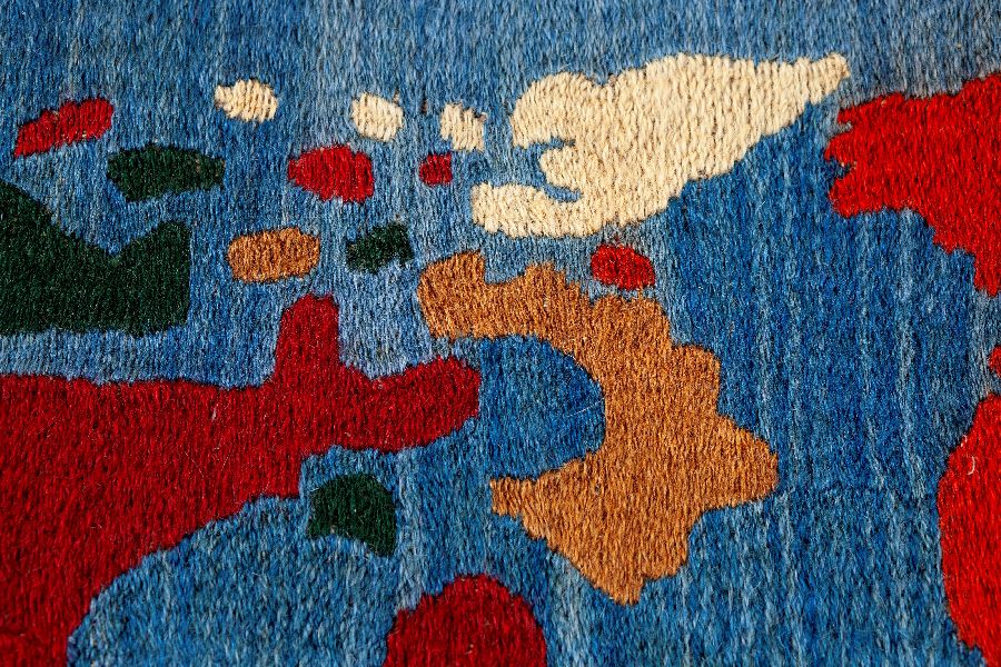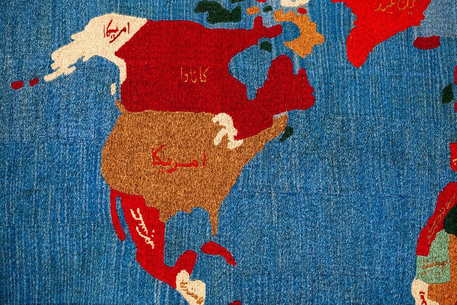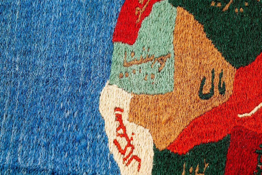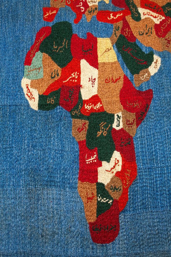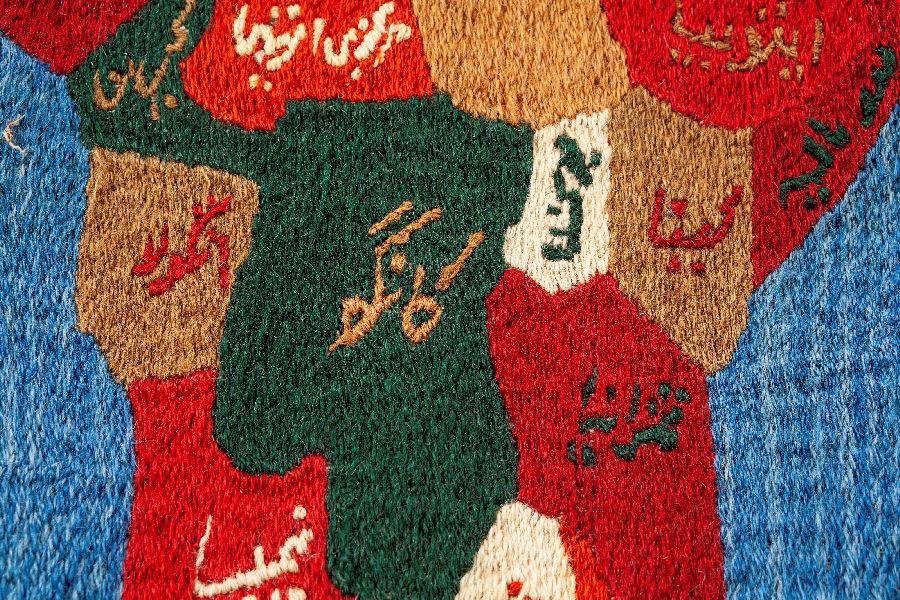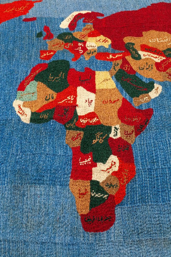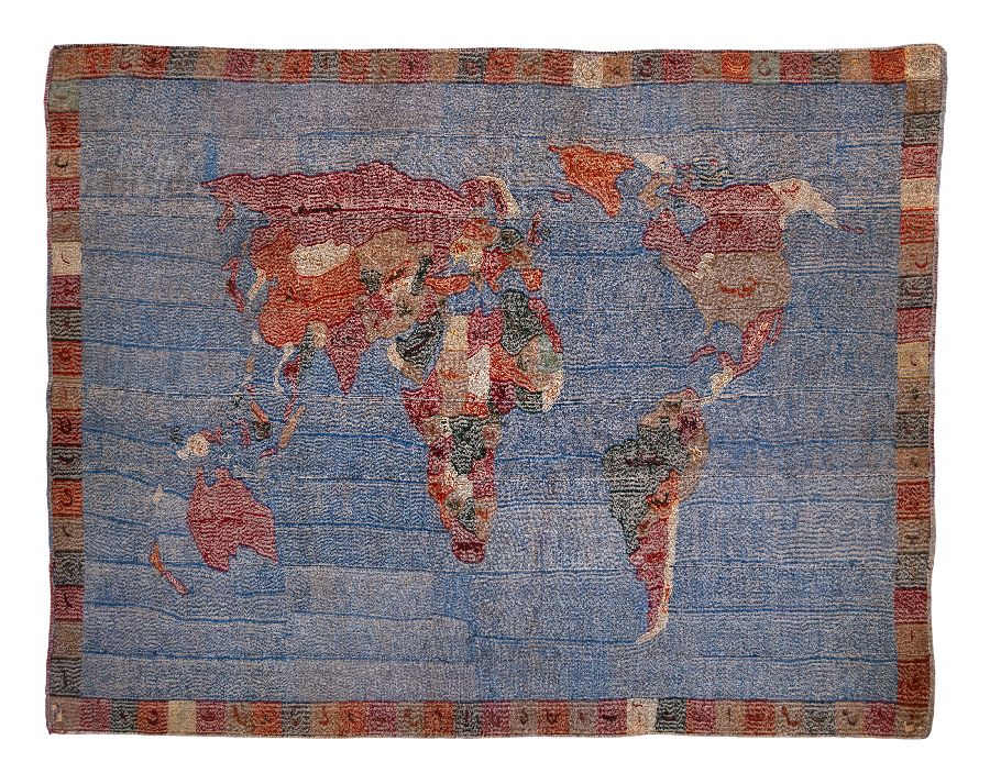 Suzani "Mappa del Mondo" ricamato in lana su tela di canapa.