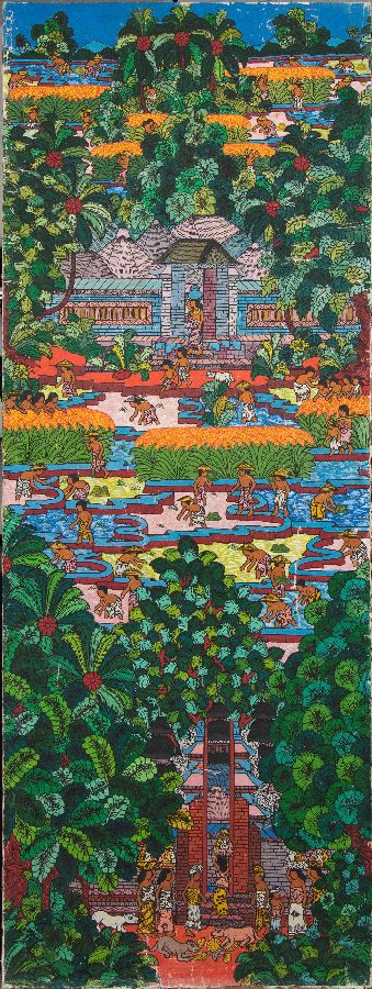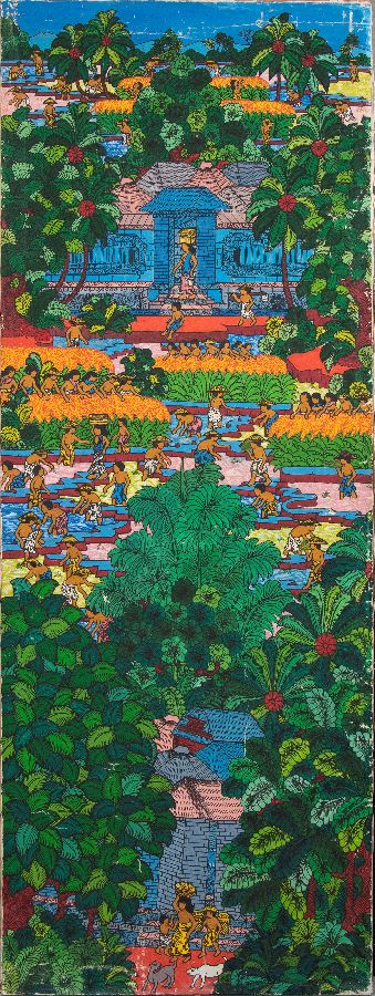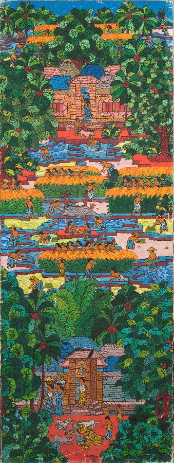 KETUT TAGEN, "Penestanan Klod Ubud Bali" Acrilico su tela Lung.69cm; Alt.240cm