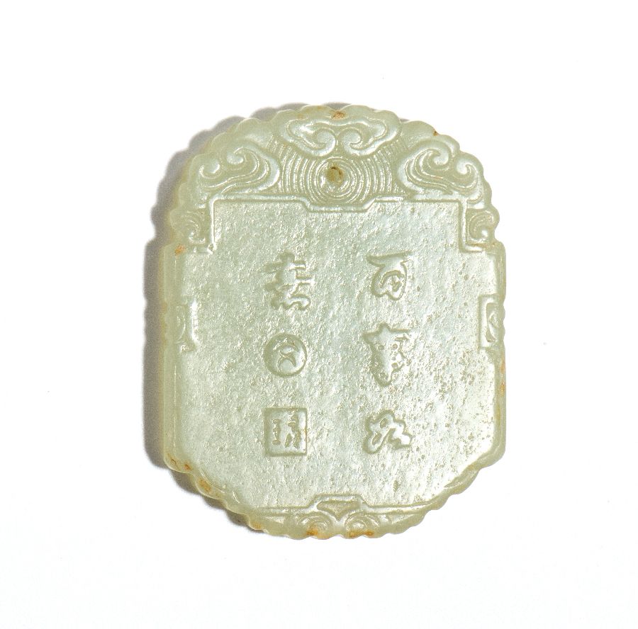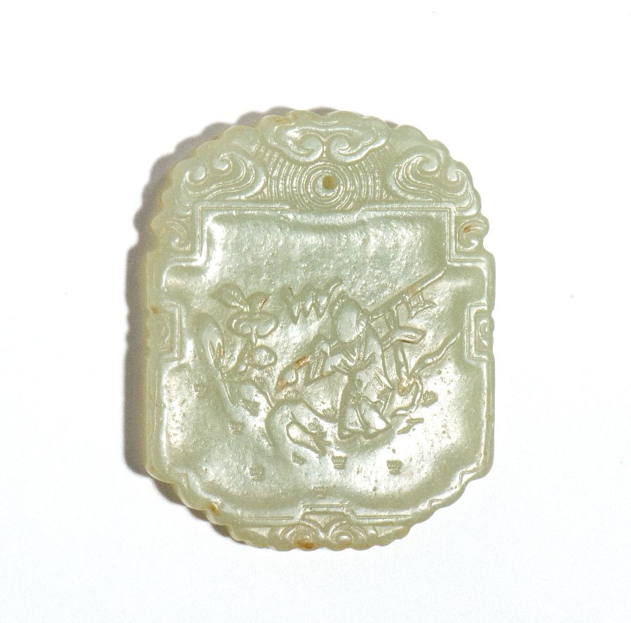Ornamento pendente in giada a rilievo con un uomo al lavoro nei campi e caratteri cinese sul retro, provvista di foro di sospensione.