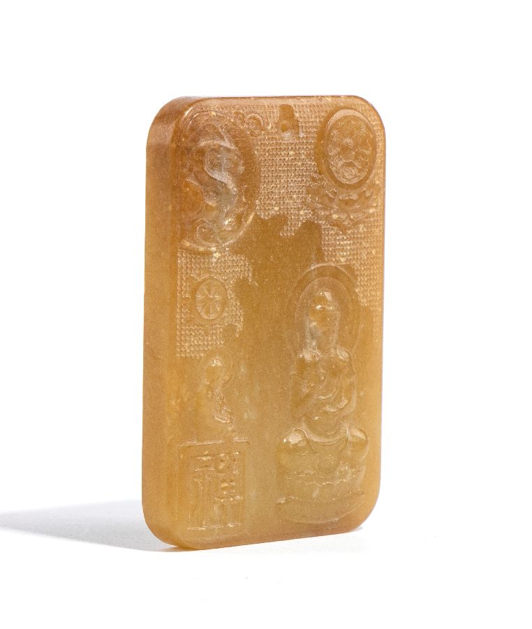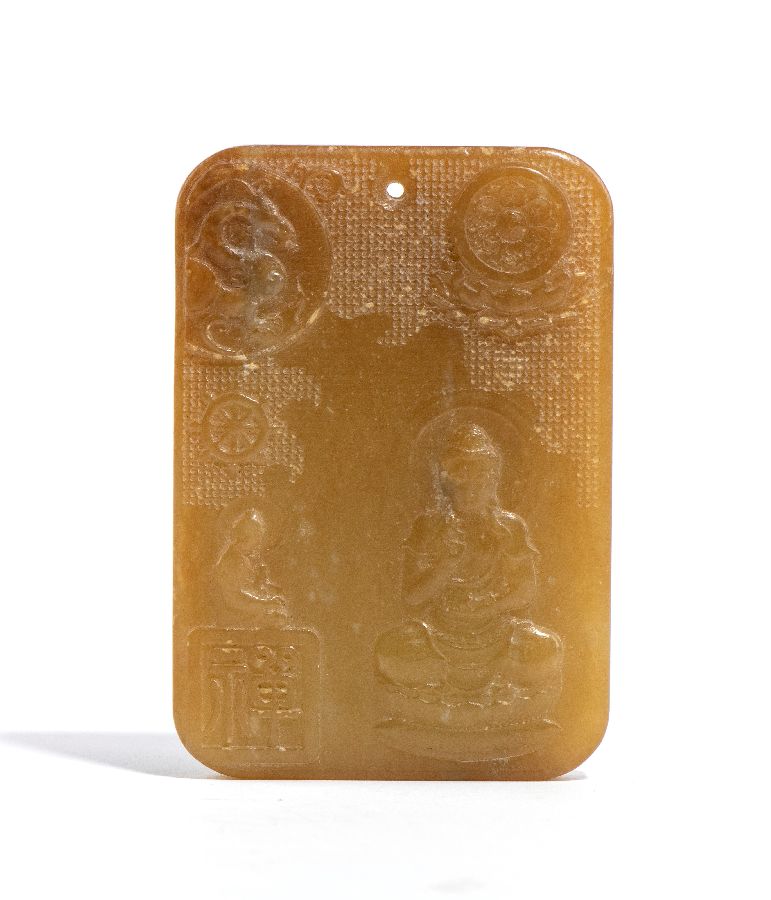 Placchetta in giada a leggero rilievo con Buddha in preghiere con discepolo e decoro floreale sul retro, provvista di foro di sospensione.