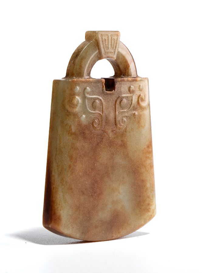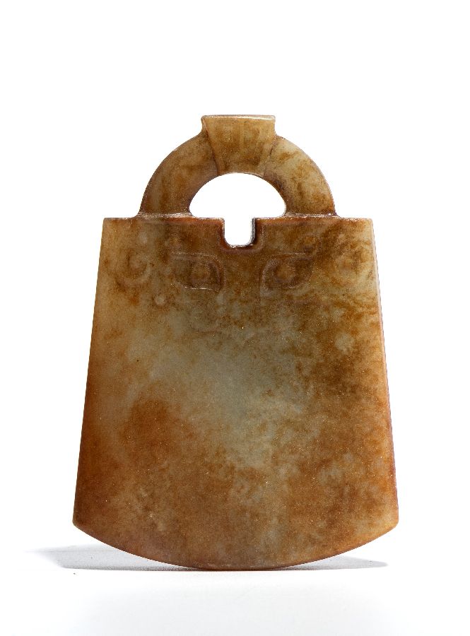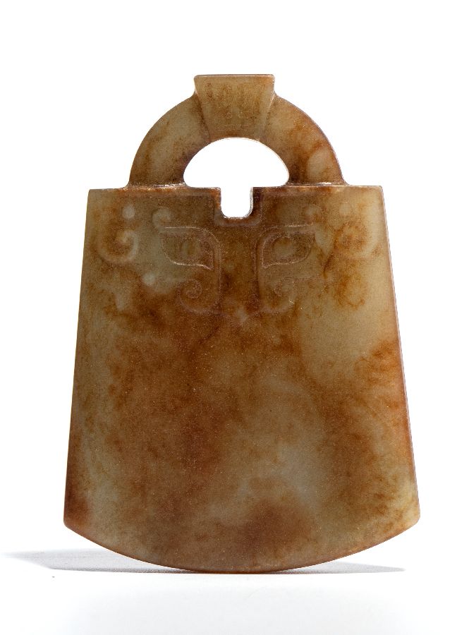 Ornamento pendente intagliato a forma di ascia in stile arcaizzante.